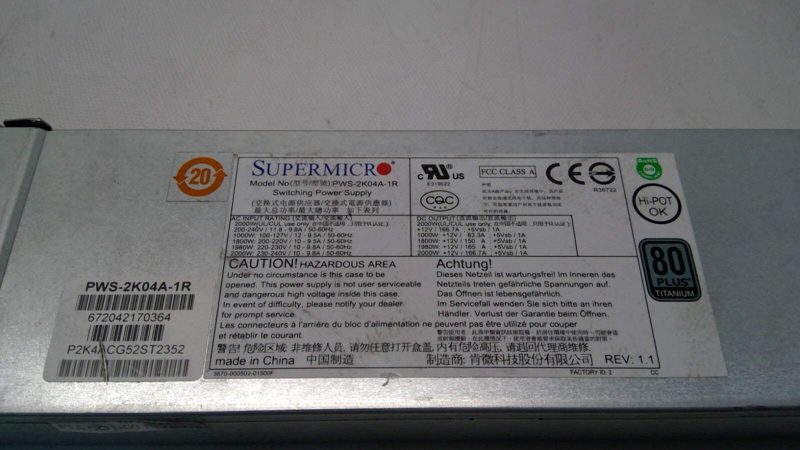 Supermicro PWS-2K04A-1R 1U 2000W Redundant PSU 80 Plus Titanium Power Supply